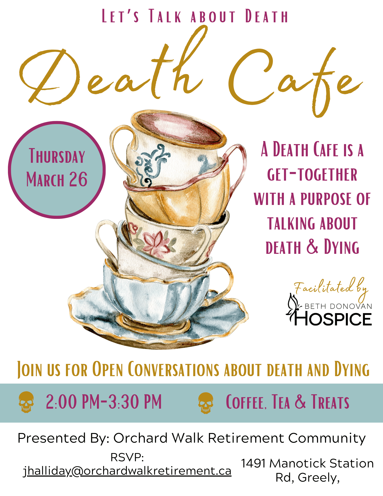 Beth Donovan Hospice and Orchard Walk Retirement Residence invite you to join us for a Death Café. This is a relaxed gathering where people can talk openly about death and dying in a safe and respectful space.
